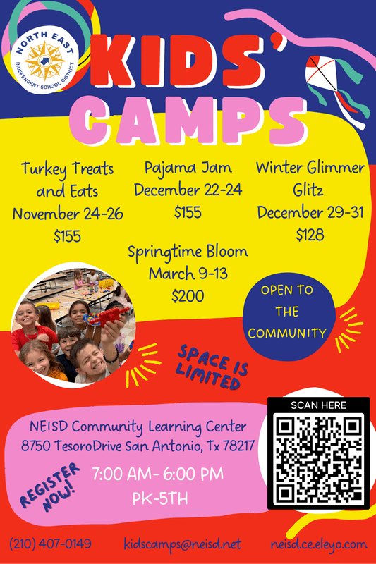 We are thrilled to offer a variety of seasonal camps for the 25-26' school year, designed for participants currently in Pre-K through 5th grade. Our full-day programs provide campers with fun-filled days of enrichment activities, outdoor play, arts and crafts, and more. Each week is themed to enhance our planned activities, ensuring engaging and memorable experiences. All activities are led by NEISD-trained employees who are dedicated to making a positive impact on your child’s life. Please note that campers are required to bring their own lunch and a reusable water bottle. We provide a light breakfast snack and an afternoon snack to keep everyone energized throughout the day.